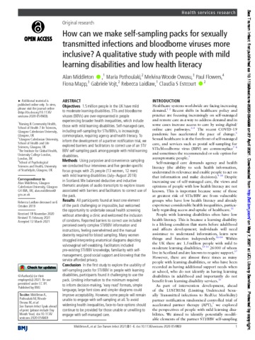 Title: | How can we make self-sampling packs for sexually transmitted infections and bloodborne viruses more inclusive? A qualitative study with people with mild learning disabilities and low health literacy |