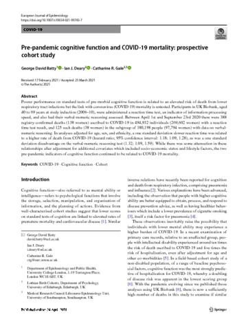 | Title: | Pre-pandemic cognitive function and COVID-19 mortality: prospective cohort study. |