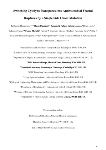 Title: | Switching Cytolytic Nanopores into Antimicrobial Fractal Ruptures by a Single Side Chain Mutation |