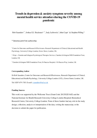 Trends in depression & anxiety symptom severity among mental health service attendees during the COVID-19 pandemic.