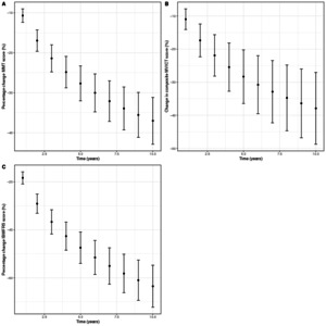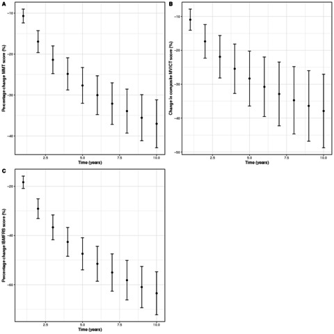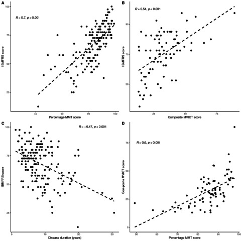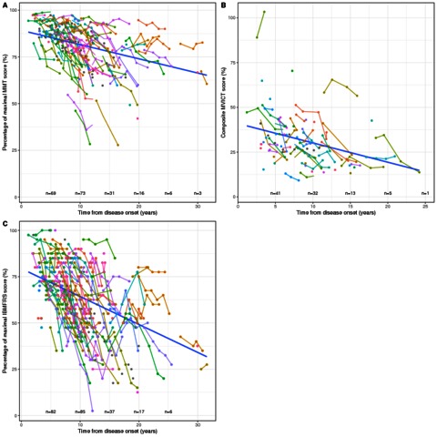 OBJECTIVE: To describe decline in muscle strength and physical function in patients with sporadic inclusion body myositis (IBM). METHODS: Manual muscle testing (MMT), quantitative muscle testing (QMT) and disability scoring using the IBM Functional Rating Scale (IBMFRS) were undertaken for 181 patients for up to 7.3 years. The relationship between MMT, QMT and IBMFRS composite scores and time from onset were examined using linear mixed effects models adjusted for gender and age of disease onset. Adaptive LASSO regression analysis was used to identify muscle groups that best predicted the time elapsed from onset. Cox proportional hazards regression was used to evaluate time to use of a mobility aid. RESULTS: Multilevel modelling of change in percentage MMT, QMT and IBMFRS score over time yielded an average decline of 3.7% (95% CI 3.1% to 4.3%), 3.8% (95% CI 2.7% to 4.9%) and 6.3% (95% CI 5.5% to 7.2%) per year, respectively. The decline, however, was not linear, with steeper decline in the initial years. Older age of onset was associated with a more rapid IBMFRS decline (p=0.007), but did not influence the rate of MMT/QMT decline. Combination of selected muscle groups allowed for generation of single measures of patient progress (MMT and QMT factors). Median (IQR) time to using a mobility aid was 5.4 (3.6-9.2) years, significantly affected by greater age of onset (HR 1.06, 95% CI 1.04 to 1.09, p<0.001). CONCLUSION: This prospective observational study represents the largest IBM cohort to date. Measures of patient progress evaluated in this study accurately predict disease progression in a reliable and useful way to be used in trial design.