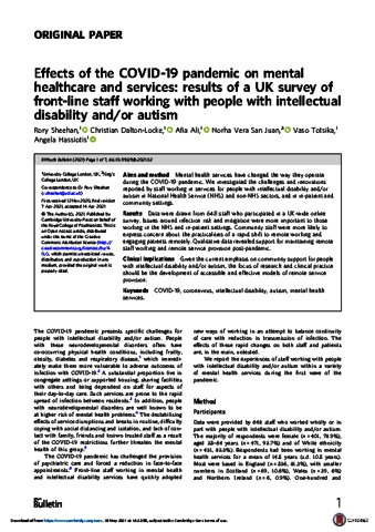 Title: | Effects of the COVID-19 pandemic on mental healthcare and services: results of a UK survey of front-line staff working with people with intellectual disability and/or autism. |
