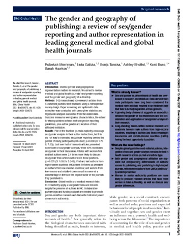Title: | The gender and geography of publishing: A review of sex/gender reporting and author representation in leading general medical and global health journals |