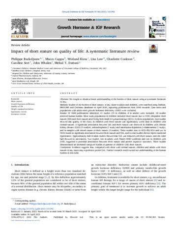 Objective: We sought to obtain a better understanding of the burden of short stature using a systematic literature review. Methods: Studies of the burden of short stature, of any cause in adults and children, were searched using Embase, MEDLINE and Cochrane databases in April 2020, capturing publications from 2008 onwards. Case series and populations with adult-onset growth hormone deficiency (GHD) were excluded. Results: Of 1684 publications identified, 41 studies (33 in children, 8 in adults) were included. All studies assessed human burden. Most study populations in children included short stature due to GHD, idiopathic short stature (ISS) and short stature after being born small for gestational age (SGA). In these populations, four studies showed that quality of life (QoL) in children with short stature was significantly worse than in children with normal stature. A significant association between QoL and short stature was observed in children with chronic kidney disease (CKD) (3 studies), achondroplasia (1 study) and transfusion-dependent β-thalassaemia (1 study), and in samples with mixed causes of short stature (3 studies). Three studies (one in GHD/ISS/SGA and two in CKD) found no significant association between short stature and QoL, and several studies did not report statistical significance. Approximately half of adult studies showed that QoL was reduced with short stature, and the other half showed no association. Two studies, one in adults with Prader–Willi syndrome and one in children with GHD, suggested a potential association between short stature and poorer cognitive outcomes. Three studies demonstrated an increased caregiver burden in parents of children with short stature. Conclusions: Evidence suggests that, compared with those with normal stature, children and adults with short stature of any cause may experience poorer QoL. Further research could extend our understanding of the human burden in this field.