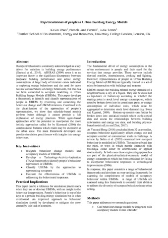 Occupant behaviour is commonly acknowledged as a key driver for variation in building energy performance (Gaetani et al., 2016). ASHRAE (2009) notes it as an important factor in the significant discrepancy between proposed building performance and actual energy consumption. A large body of literature exists dedicated to exploring energy behaviours and the need for more holistic considerations of energy behaviours, but this has not been connected to occupant modelling in Urban Building Energy Models (UBEMs). This paper develops a framework to identify and classify representations of people in UBEMs by reviewing and connecting the behaviour change and UBEM literatures. Combined with the classification of the approaches of people’s representation, we show that schedule-based models perform better although it cannot provide a full explanation of energy practices. While agent-based approaches offer the potential to incorporate the more holistic approaches called for by Kierstead (2006) the computational burdens which result may be excessive at the urban scale. The main framework developed can provide simulation practitioners with insights into energy behaviours.