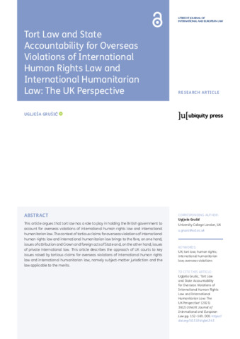 Title: | Tort Law and State Accountability for Overseas Violations of International Human Rights and International Humanitarian Law: the UK Perspective |