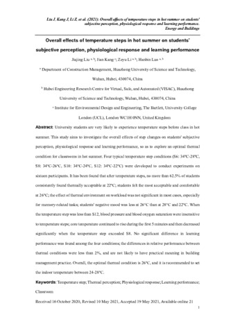 Overall effects of temperature steps in hot summer on students' subjective perception, physiological response and learning performance.pdf - Accepted Version Download (2MB) | Preview |