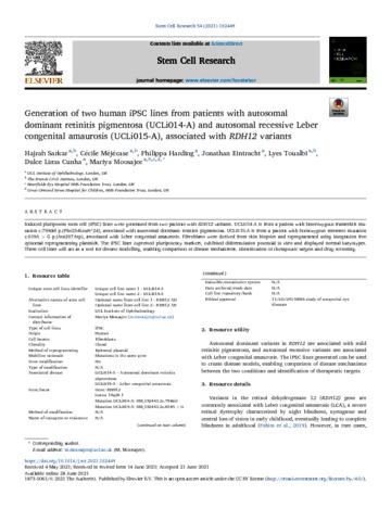 | Title: | Generation of two human iPSC lines from patients with autosomal dominant retinitis pigmentosa (UCLi014-A) and autosomal recessive Leber congenital amaurosis (UCLi015-A), associated with RDH12 variants |
