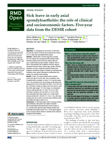 | Title: | Sick leave in early axial spondyloarthritis: the role of clinical and socioeconomic factors. Five-year data from the DESIR cohort |