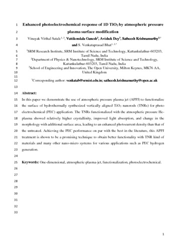 Title: | Enhanced photoelectrochemical response of 1D TiO₂ by atmospheric pressure plasma surface modification |