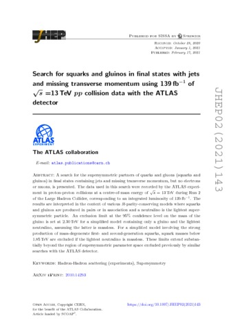 | Title: | Search for squarks and gluinos in final states with jets and missing transverse momentum using 139 fb−1 of s√ = 13 TeV pp collision data with the ATLAS detector |