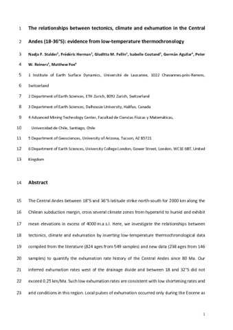 | Keywords: | Low-temperature thermochronology; Climate; Tectonics; Exhumation; Central Andes |