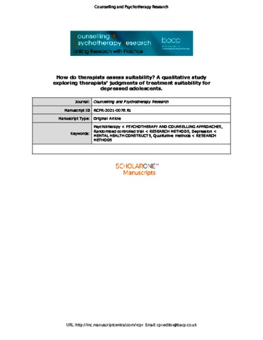 How do therapists assess suitability? A qualitative study exploring therapists' judgements of treatment suitability for depressed adolescents.
