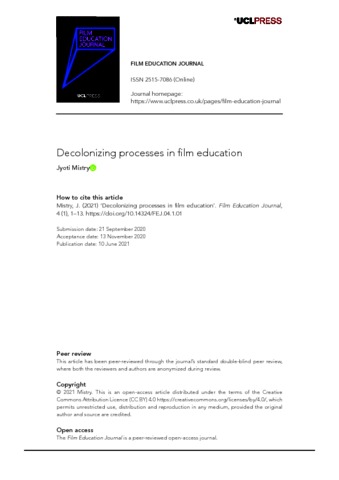 This paper considers what decolonizing film education might mean through a series of research initiatives undertaken across different cultures which explore social media platforms for creating moving image sequences. The paper attends to three factors in the current climate of education: the accessibility of the medium, its immediacy in dissemination, and the democratizing effect that these conditions have had on the medium of film. Working with these three conditions in contemporary film education, the case studies described include workshops that aimed to shift the curriculum from film canons to proposing the introduction of concepts. Furthermore, elided histories are explored through site-specific projects that show how decolonial processes allow these histories to be reclaimed in film practice, and for marginal subjectivities to be made visible. Finally, the proposal of decolonial processes seeks to work with creating opportunities for social and historical visibilities. The proposition is to work with film(ed) evidence as material connected to broader social justice issues that are expressed through aesthetic forms closely associated with decolonial processes and described as decolonial aesthesis.