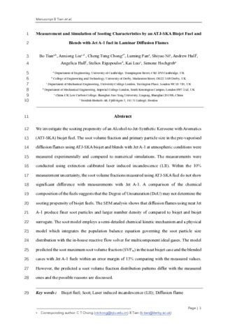 | Title: | Measurement and simulation of sooting characteristics by an ATJ-SKA biojet fuel and blends with Jet A-1 fuel in laminar non-premixed flames |