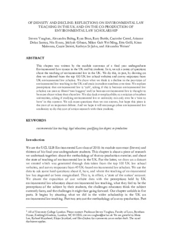 | Title: | Of density and decline: Reflections on environmental law teaching in the UK and on the co-production of environmental law scholarship |