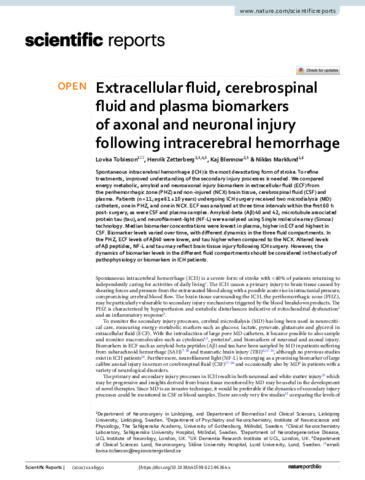 | Title: | Extracellular fluid, cerebrospinal fluid and plasma biomarkers of axonal and neuronal injury following intracerebral hemorrhage |