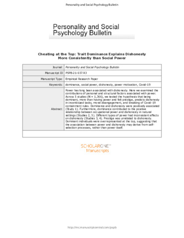 Cheating at the Top: Trait Dominance Explains Dishonesty More Consistently than Social Power.