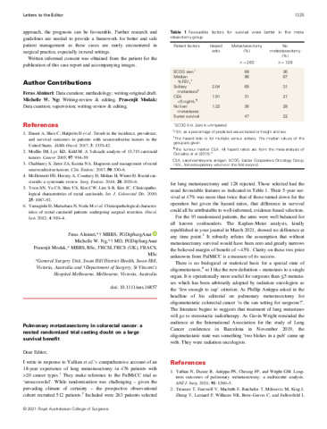 Title: | Pulmonary metastasectomy in colorectal cancer: a nested randomized trial casting doubt ona large survival benefit |