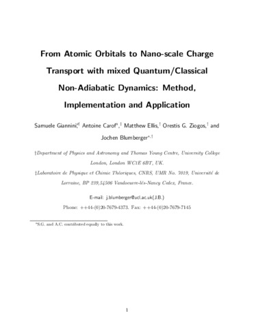 Title: | From Atomic Orbitals to Nano-scale Charge Transport with Mixed Quantum/Classical Non-adiabatic Dynamics: Method, Implementation and Application |