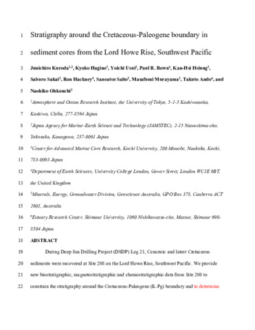 Title: | Stratigraphy around the Cretaceous-Paleogene boundary in sediment cores from the Lord Howe Rise, Southwest Pacific |