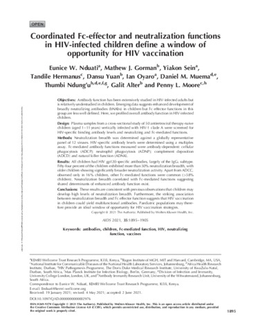 Title: | Coordinated Fc-effector and neutralization functions in HIV-infected children define a window of opportunity for HIV vaccination |