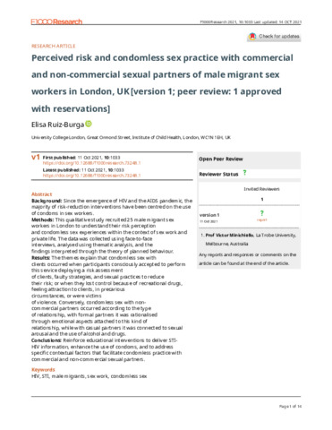 Title: | Perceived risk and condomless sex practice with commercial and non-commercial sexual partners of male migrant sex workers in London, UK |