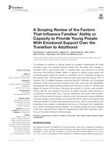 Title: | A Scoping Review of the Factors That Influence Families’ Ability or Capacity to Provide Young People With Emotional Support Over the Transition to Adulthood |