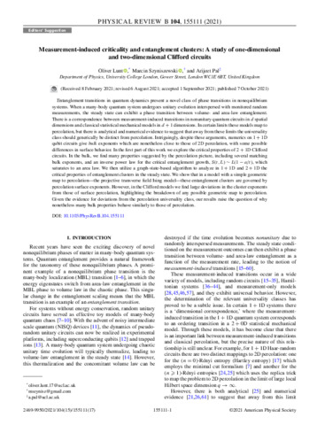 Title: | Measurement-induced criticality and entanglement clusters: A study of one-dimensional and two-dimensional Clifford circuits |