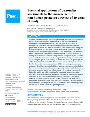 Title: | Potential applications of personality assessments to the management of non-human primates: a review of 10 years of study |