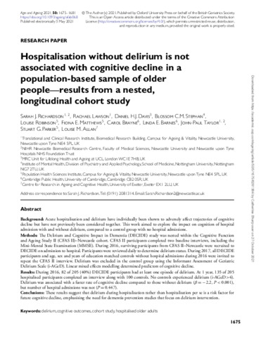 Background: Acute hospitalisation and delirium have individually been shown to adversely affect trajectories of cognitive decline but have not previously been considered together. This work aimed to explore the impact on cognition of hospital admission with and without delirium, compared to a control group with no hospital admissions. // Methods: The Delirium and Cognitive Impact in Dementia (DECIDE) study was nested within the Cognitive Function and Ageing Study II (CFAS II)–Newcastle cohort. CFAS II participants completed two baseline interviews, including the Mini-Mental State Examination (MMSE). During 2016, surviving participants from CFAS II–Newcastle were recruited to DECIDE on admission to hospital. Participants were reviewed daily to determine delirium status. During 2017, all DECIDE participants and age, sex and years of education matched controls without hospital admissions during 2016 were invited to repeat the CFAS II interview. Delirium was excluded in the control group using the Informant Assessment of Geriatric Delirium Scale (i-AGeD). Linear mixed effects modelling determined predictors of cognitive decline. // Results: During 2016, 82 of 205 (40%) DECIDE participants had at least one episode of delirium. At 1 year, 135 of 205 hospitalised participants completed an interview along with 100 controls. No controls experienced delirium (i-AGeD>4). Delirium was associated with a faster rate of cognitive decline compared to those without delirium (β = −2.2, P < 0.001), but number of hospital admissions was not (P = 0.447). // Conclusions: These results suggest that delirium during hospitalisation rather than hospitalisation per se is a risk factor for future cognitive decline, emphasising the need for dementia prevention studies that focus on delirium intervention.