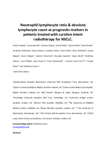 | Title: | Neutrophil-Lymphocyte Ratio and Absolute Lymphocyte Count as Prognostic Markers in Patients Treated with Curative-intent Radiotherapy for Non-small Cell Lung Cancer |