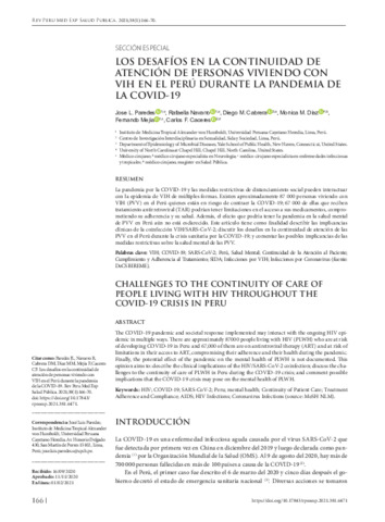Los desafíos en la continuidad de atención de personas viviendo con VIH en el Perú durante la pandemia de la COVID-19 [Challenges to the continuity of care of people living with HIV throughout the COVID-19 crisis in Peru].