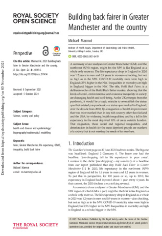 A summary of our analyses in Greater Manchester (GM), and the northwest (NW) region, might be: the NW is like England as a whole only more so. The life expectancy drop in England in 2020 was 1.2 years in men and 0.9 years in women-shocking, but not as high as in the NW. COVID-19 mortality rates were high in England; 25% higher in the NW. Inequalities in mortality are high in England; bigger in the NW. The title, Build Back Fairer, is a deliberate echo of the Build Back Better mantra, showing that the levels of social, environmental and economic inequality in society are damaging health and well-being. As the UK emerges from the pandemic, it would be a tragic mistake to re-establish the status quo that existed pre-pandemic-a status quo marked in England, over the decade from 2010, by a stagnation of health improvement that was more marked than in any rich country other than Iceland and the USA; by widening health inequalities; and by a fall in life expectancy in the most deprived 10% of areas outside London. That stagnation, those social and regional inequalities, and deterioration in health for the most deprived people are markers of a society that is not meeting the needs of its members.