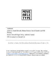 With this issue of Moveable Type, we hope to set in motion a new wave of interest in ambient literature, seeking new insight into the patterns and thematics of ambient writing and bringing to light discussions left unresolved by various critiques of ambience. Our issue theme of Ambience presents a conversation between a group of scholars, writers and reviewers who locate ambient literatures beyond apps and web browsers, identify new research trajectories, and challenge definitions of ambient literature, countering its contemporariness and reliance on technology by foregrounding precursors to ambient literature. We suggest that these developments be considered beyond a distraction or aberrant offshoot of book history; as contiguous with historic reader response practice; and that they may come to be an important component or even central element of composition and reception.
