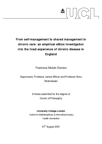 Title: | From self-management to shared management in chronic care: an empirical ethics investigation into the lived experience of chronic disease in England |