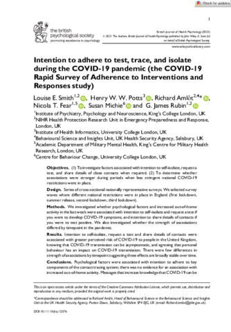 Intention to adhere to test, trace, and isolate during the COVID-19 pandemic (the COVID-19 Rapid Survey of Adherence to Interventions and Responses study).