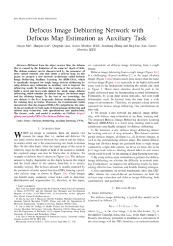 Title: | Defocus Image Deblurring Network with Defocus Map Estimation as Auxiliary Task |