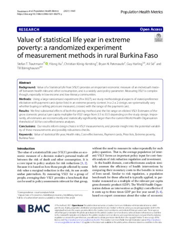 | Title: | Value of statistical life year in extreme poverty: a randomized experiment of measurement methods in rural Burkina Faso |
