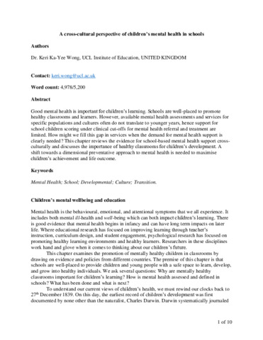 Title: | A Cross-cultural Perspective of Children's Mental Health in School: An Exacerbated Issue during the COVID-19 Pandemic |