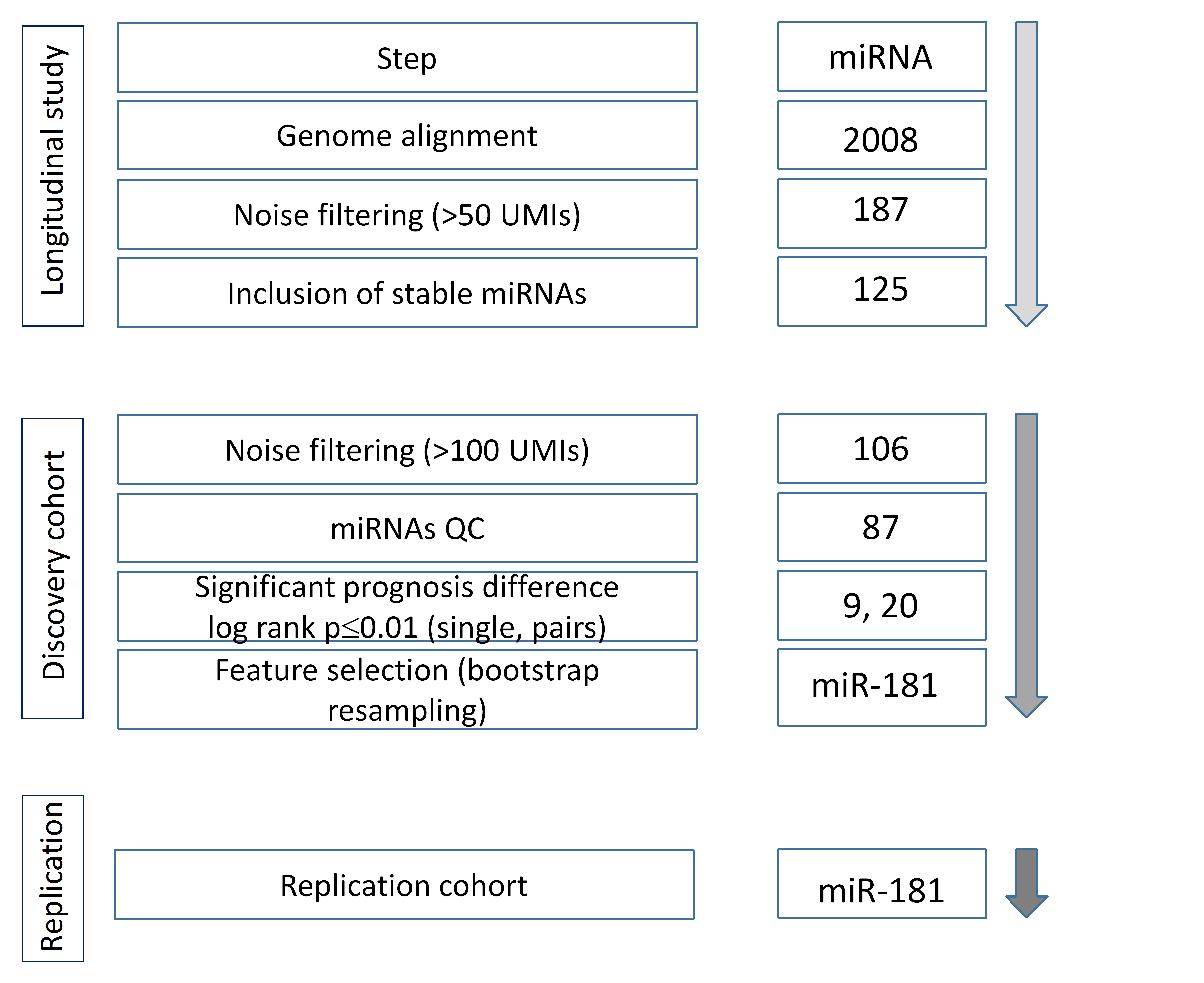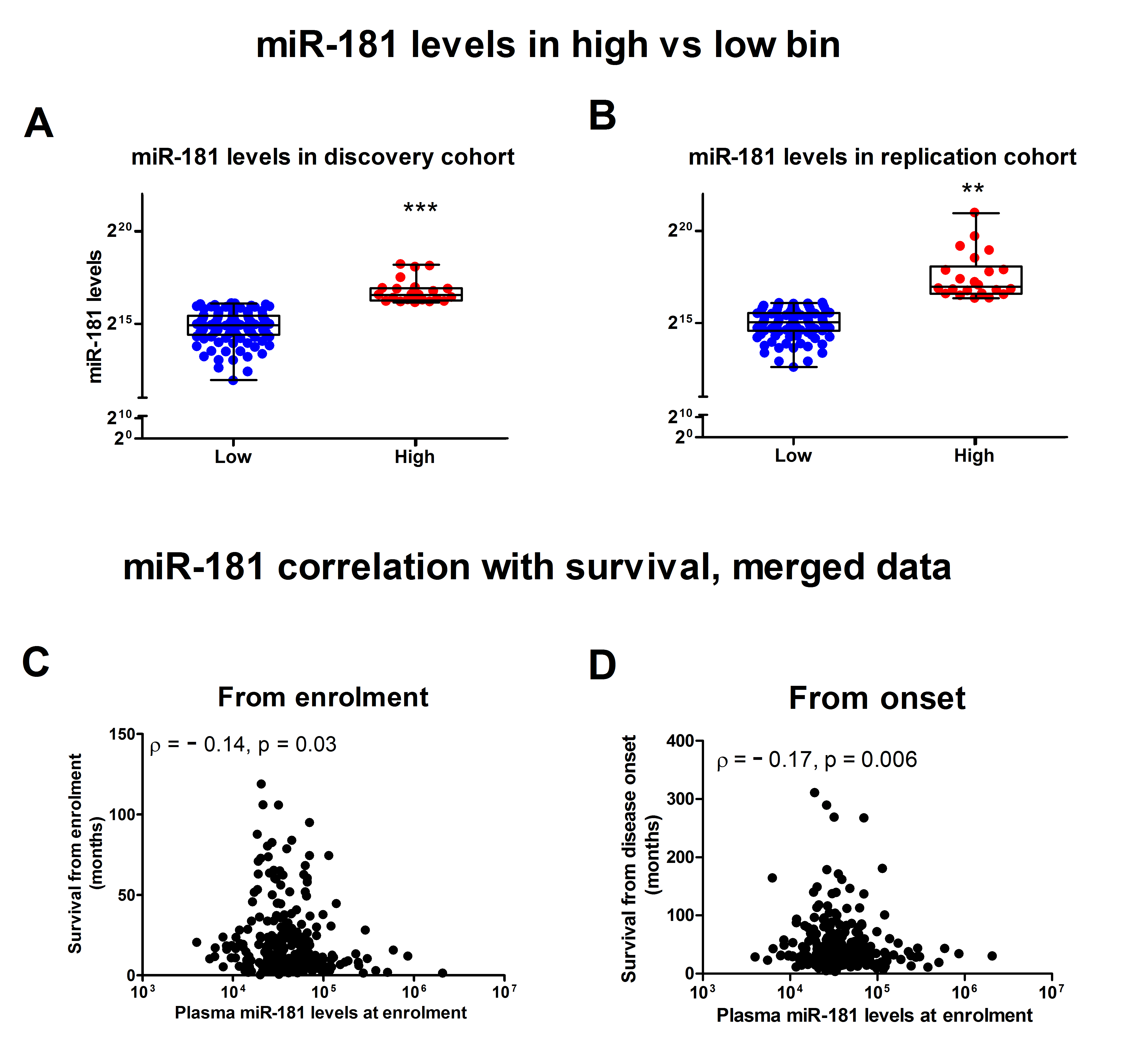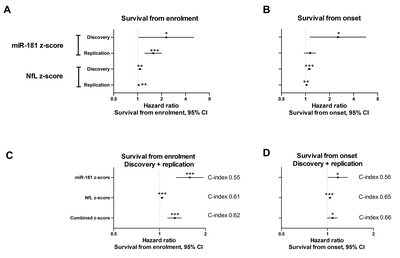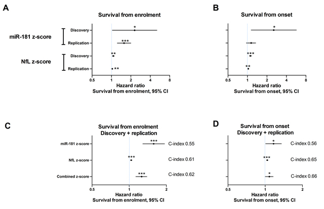 Amyotrophic lateral sclerosis (ALS) is a relentless neurodegenerative disease of the human motor neuron system, where variability in progression rate limits clinical trial efficacy. Therefore, better prognostication will facilitate therapeutic progress. In this study, we investigated the potential of plasma cell-free microRNAs (miRNAs) as ALS prognostication biomarkers in 252 patients with detailed clinical phenotyping. First, we identified, in a longitudinal cohort, miRNAs whose plasma levels remain stable over the course of disease. Next, we showed that high levels of miR-181, a miRNA enriched in neurons, predicts a greater than two-fold risk of death in independent discovery and replication cohorts (126 and 122 patients, respectively). miR-181 performance is similar to neurofilament light chain (NfL), and when combined together, miR-181 + NfL establish a novel RNA–protein biomarker pair with superior prognostication capacity. Therefore, plasma miR-181 alone and a novel miRNA–protein biomarker approach, based on miR-181 + NfL, boost precision of patient stratification. miR-181-based ALS biomarkers encourage additional validation and might enhance the power of clinical trials.