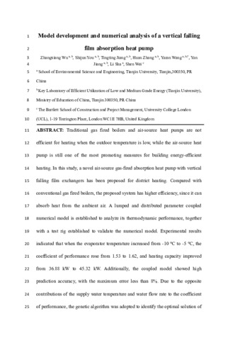 Wei_ Model development and numerical analysis of a vertical falling film absorption heat pump_AAM.pdf - Accepted Version Download (9MB) | Preview |