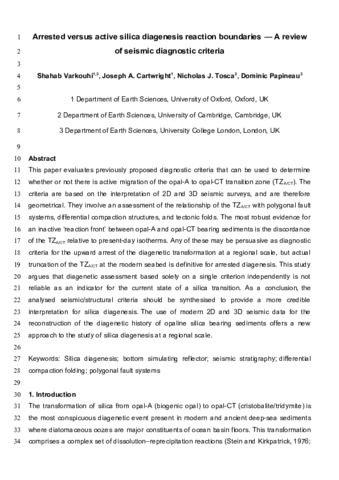 | Title: | Arrested versus active silica diagenesis reaction boundaries—A review of seismic diagnostic criteria |