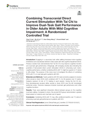 Introduction: Engaging in a secondary task while walking increases motor-cognitive interference and exacerbates fall risk in older adults with mild cognitive impairment (MCI). Previous studies have demonstrated that Tai Chi (TC) may improve cognitive function and dual-task gait performance. Intriguingly, with emerging studies also indicating the potential of transcranial direct current stimulation (tDCS) in enhancing such motor-cognitive performance, whether combining tDCS with TC might be superior to TC alone is still unclear. The purpose of this study was to investigate the effects of combining tDCS with TC on dual-task gait in patients with MCI. / Materials and Methods: Twenty patients with MCI were randomly assigned to receive either anodal or sham tDCS, both combined with TC, for 36 sessions over 12 weeks. Subjects received 40 min of TC training in each session. During the first 20 min, they simultaneously received either anodal or sham tDCS over the left dorsolateral prefrontal cortex. Outcome measures included dual-task gait performance and other cognitive functions. / Results: There were significant interaction effects between groups on the cognitive dual task walking. Compared to sham, the anodal tDCS group demonstrated a greater improvement on cadence and dual task cost of speed. / Conclusion: Combining tDCS with TC may offer additional benefits over TC alone in enhancing dual-task gait performance in patients with MCI. / Clinical Trial Registration: [www.ClinicalTrials.gov], identifier [TCTR20201201007].