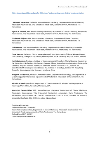 Title: | Blood-based biomarkers for Alzheimer's disease: towards clinical implementation |