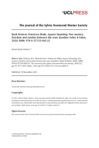 Title: | Book Review: Francesca Wade, Square Haunting: Five women, freedom and London between the wars (London: Faber & Faber, 2020; ISBN: 978-0-57133-065-2) |