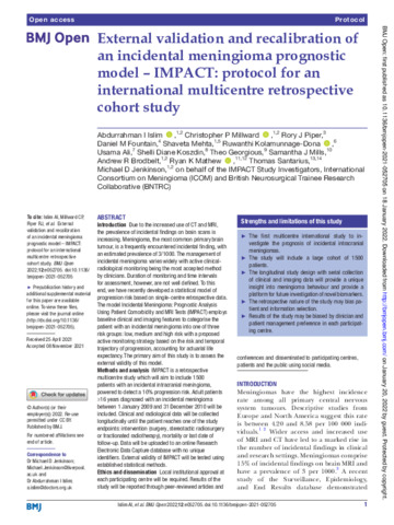 Title: | External validation and recalibration of an incidental meningioma prognostic model – IMPACT: protocol for an international multicentre retrospective cohort study |