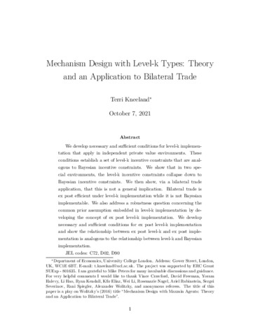 Title: | Mechanism Design with Level-k Types: Theory and an Application to Bilateral Trade |