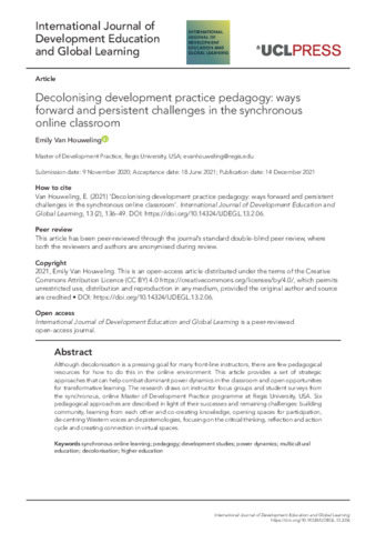 | Title: | Decolonising development practice pedagogy: ways forward and persistent challenges in the synchronous online classroom |