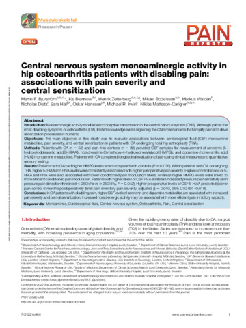 Title: | Central nervous system monoaminergic activity in hip osteoarthritis patients with disabling pain: associations with pain severity and central sensitization |